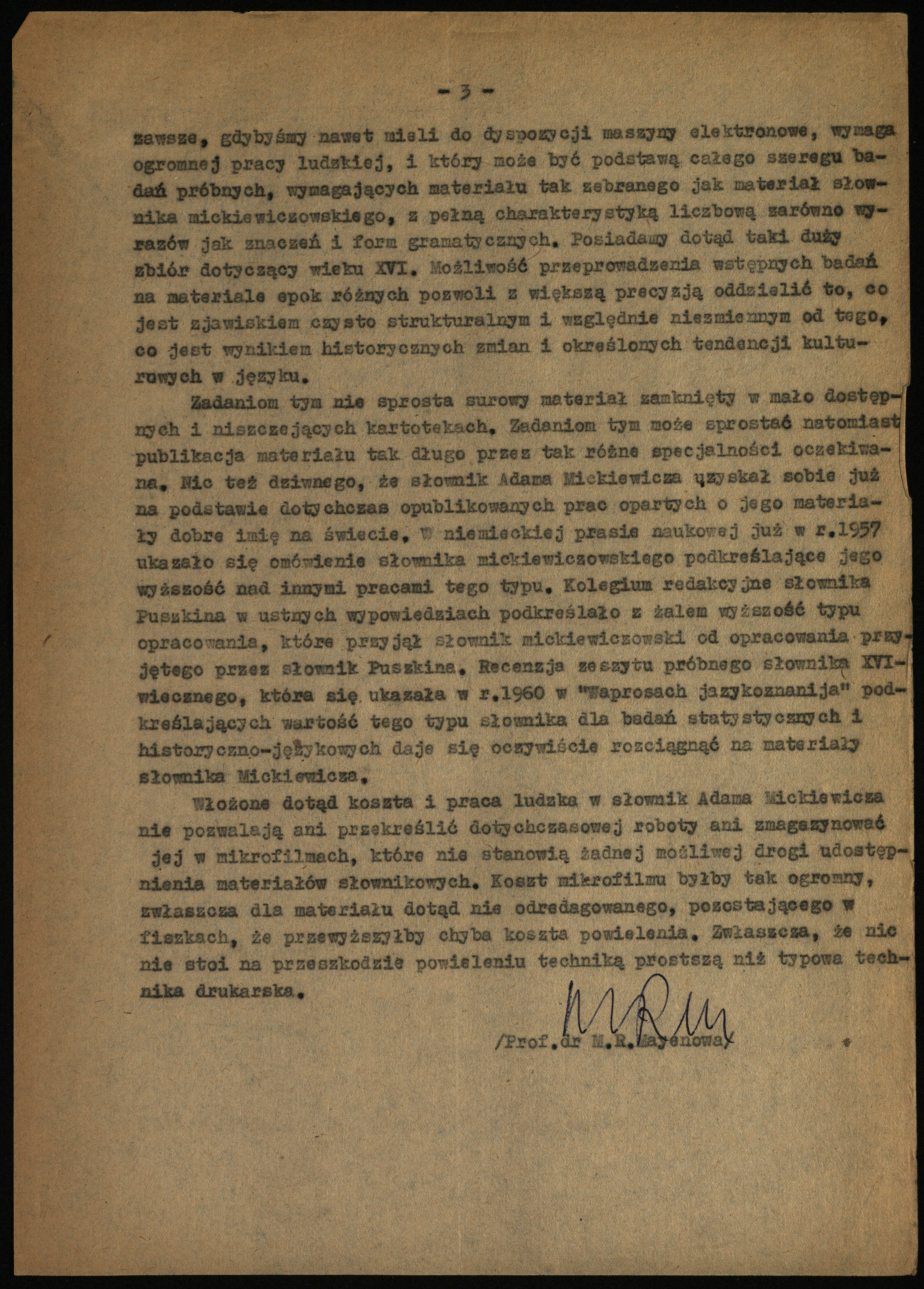 słownik Adama Mickiewicza nie pozwalają ani przekreślić dotychczasowej roboty ani zmagazynować jej w mikrofilmach, które nie stanowią żadnej możliwej drogi udostępnienia materiałów słownikowych. Koszt mikrofilmu byłby tak ogromny, zwłaszcza dla materiału dotąd nie odredagowanego, pozostającego w fiszkach, że przewyższyłby chyba koszta powielenia. Zwłaszcza, że nic nie stoi na przeszkodzie powieleniu techniką prostszą niż typowa technika drukarska.
