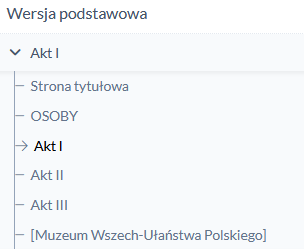 W obu tych „spisach treści”, obok trzech aktów dramatu – znalazły się: strona tytułowa, spis postaci dramatu („Osoby”) oraz link do – zamieszczonej na osobnej stronie – galerii cyfrowej Muzeum Wszech-Ułaśstwa Polskiego: https://nplp.pl/dramat-reaktywacja/muzeum-wszech-ulanstwa-polskiego/.