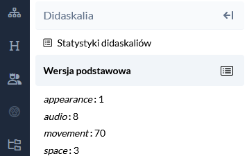 pozwala zobaczyć – na ekranie głównym – statystykę poszczególnych typów didaskaliów dla poszczególnych scen.