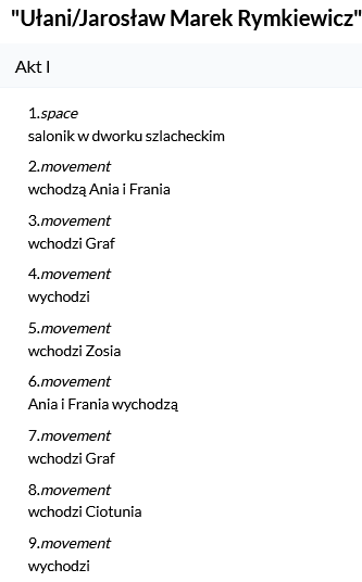 W bocznym panelu wyświetla się wówczas ogólna statystyka didaskaliów dla całego dramatu. W przypadku Ułanów zdecydowanie dominują didaskalia odnoszące się do ruchu postaci („movement”):