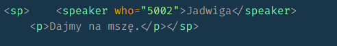 Do oznaczania wypowiedzi postaci użyto znacznika “speaker” wraz z unikalnym identyfikatorem przypisanym danej postaci.