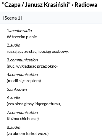 Drugim elementem struktury TEI są didaskalia – oznaczone, zgodnie ze schematem wskazanym w TEI Guidelines, znacznikiem “stage”. Tak wygląda np. jedno z didaskaliów w scenie I w wersji 1 (radiowej) tekstu: